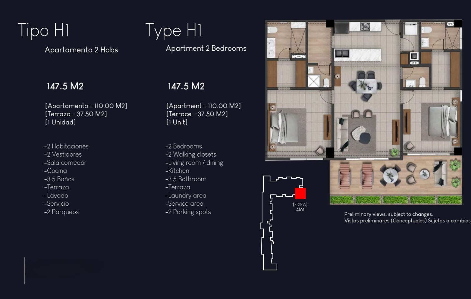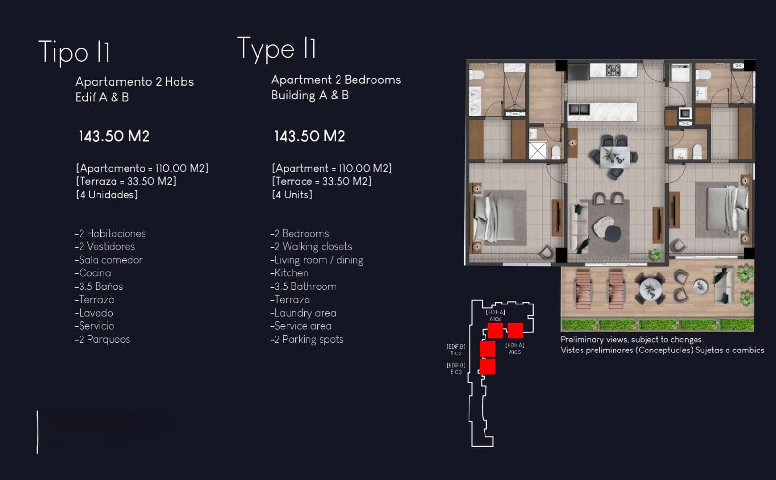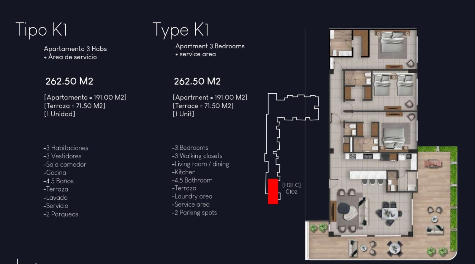 TIPO A I (107.24 m²) Apartamento: 73.96 m² Balcón: 12.78 m² Terraza: 20.50 m² 1 Dormitorio Walking Closet Sala Comedor Cocina 2 baños Balcón Lavado