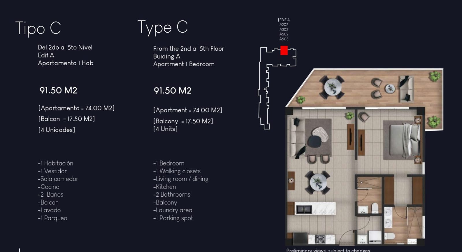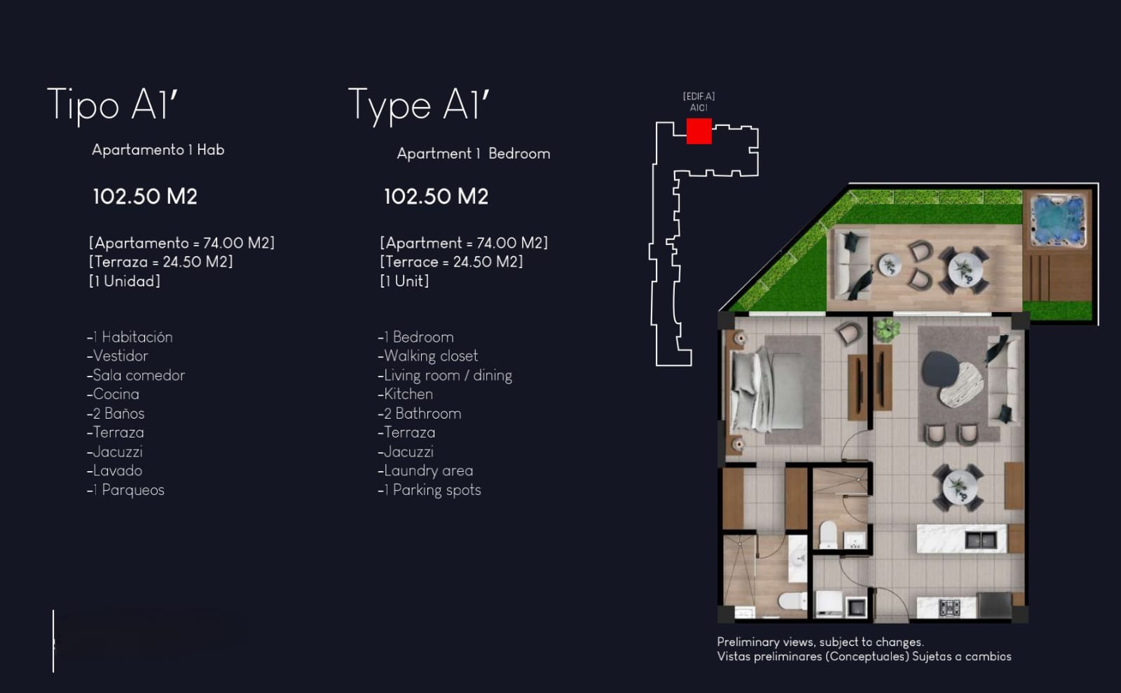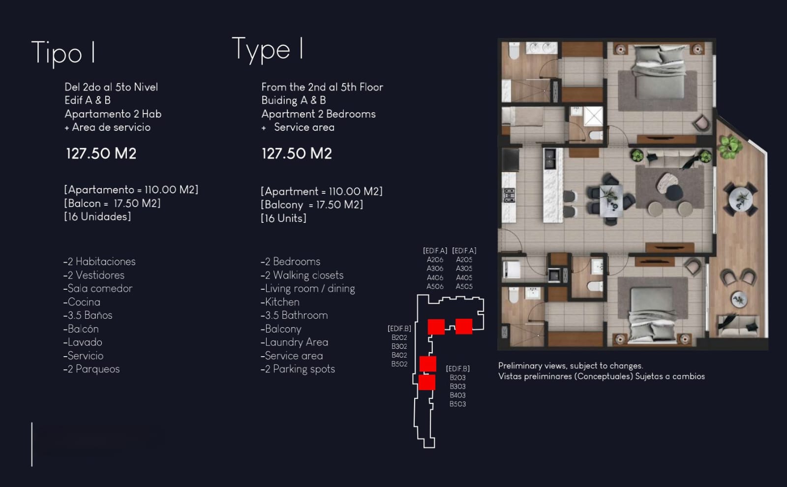 TIPO A I (107.24 m²) Apartamento: 73.96 m² Balcón: 12.78 m² Terraza: 20.50 m² 1 Dormitorio Walking Closet Sala Comedor Cocina 2 baños Balcón Lavado